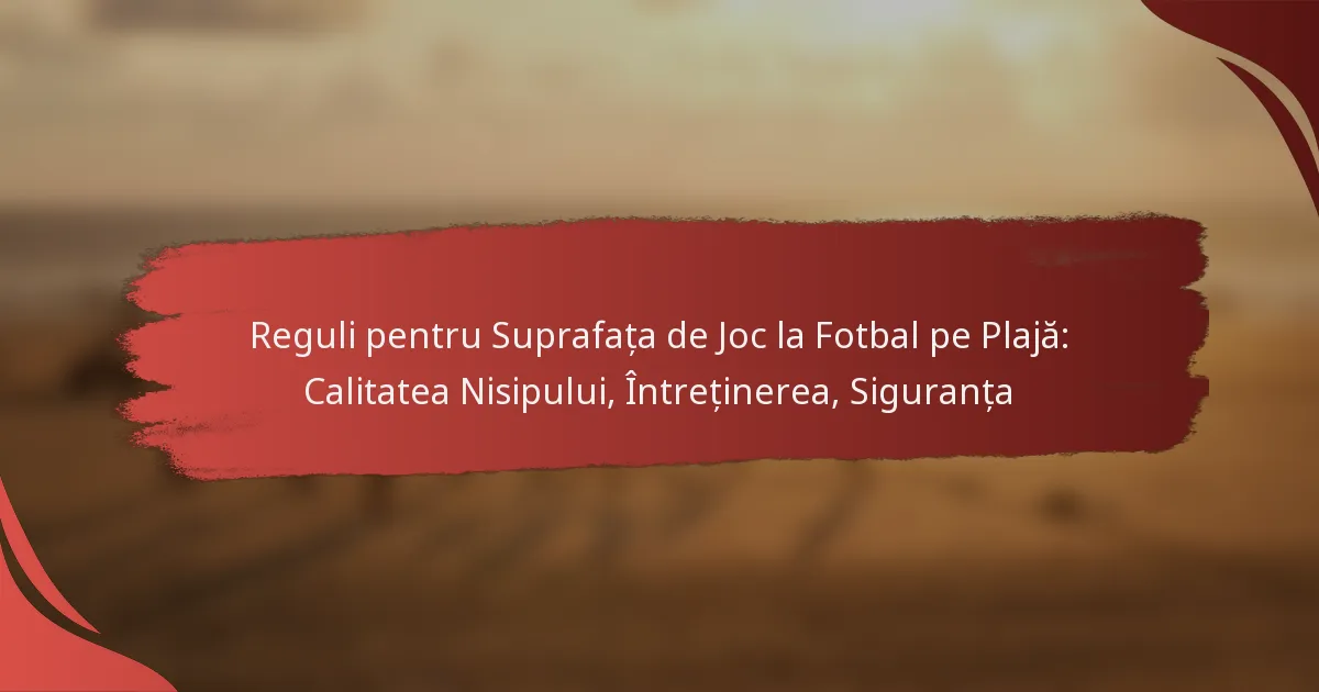 Fotbalul pe plajă necesită o suprafață de nisip întreținută cu grijă pentru a asigura atât o jucabilitate optimă, cât și siguranța jucătorilor. Factori cheie, cum ar fi dimensiunea și compoziția granulelor de nisip, împreună cu practicile de întreținere regulată, sunt esențiali pentru crearea unui mediu de joc sigur și plăcut. În plus, implementarea măsurilor de siguranță, inclusiv inspecțiile de risc și disponibilitatea primului ajutor, este vitală pentru a proteja jucătorii de accidente în timpul jocurilor.